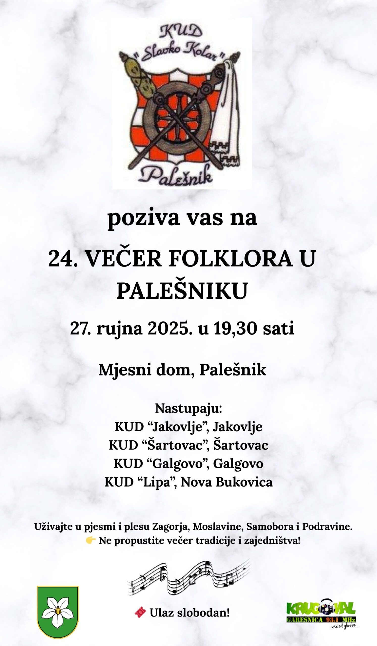 U subotu, 27. rujna se u Palešniku održava tradicionalna “24. Večer folklora” u organizaciji tamošnjeg KUD-a “Slavko Kolar”. Program se održava u Mjesnom domu s početkom u 19,30 sati uz slobodan ulaz.