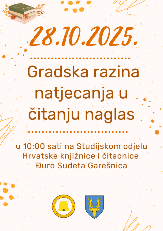 Garešnička Hrvatska knjižnica i čitaonica Đuro Sudeta u listopadu ponovno organizira zanimljivo natjecanje mladih čitača i govornika. U njemu će sudjelovati učenici iz Osnovne škole Slavka Kolara Hercegovac, OŠ Berek, OŠ Trnovitica iz Velike Trnovitice, OŠ Trnovitički Popovac i OŠ Garešnica. Natjecanje će se provesti u dvije kategorije, a ukupno 20 učenika pokazat će svoje vještine izražavanja i čitanja, 28. listopada s početkom u 10 sati.