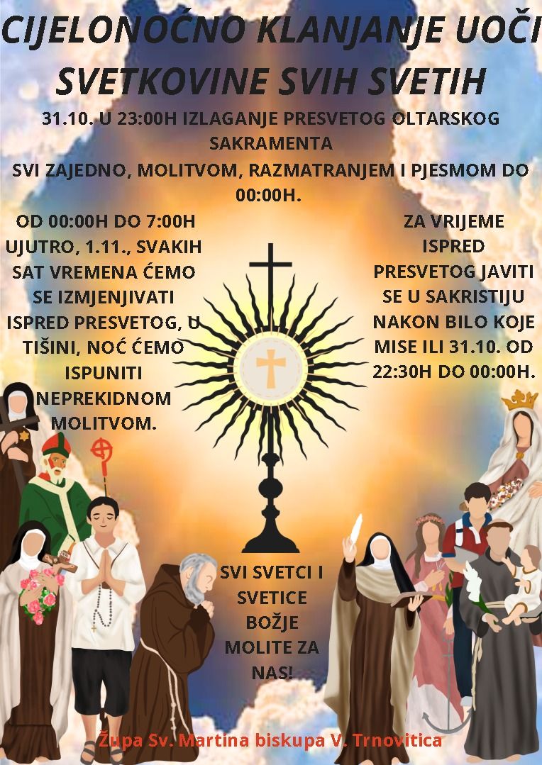 U Župi svetog Martina u Velikoj Trnovitici organizirano je cjelonoćno klanjanje pred Presvetim uoči svetkovine Svih Svetih. Počet će u petak u 23 sata zajedničkom molitvom do ponoći, a potom će se do 7 sati ujutro vjernici izmjenjivati svakih sat vremena u tihoj molitvi.
