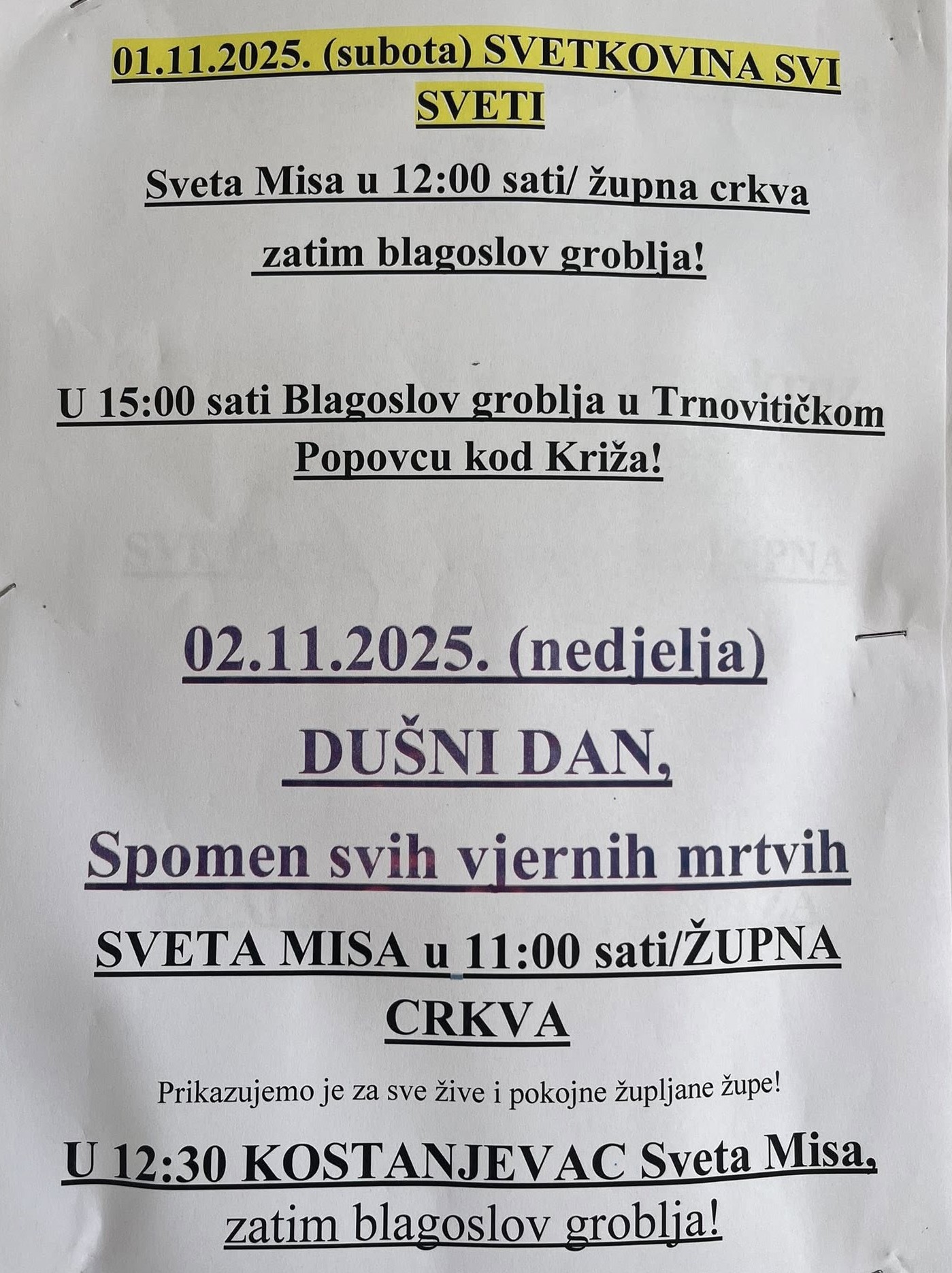 Na Dušni dan sveta misa u župnoj crkvi bit će u 11 sati, a u Kostanjevcu u 12:30, zajedno s blagoslovom groblja.