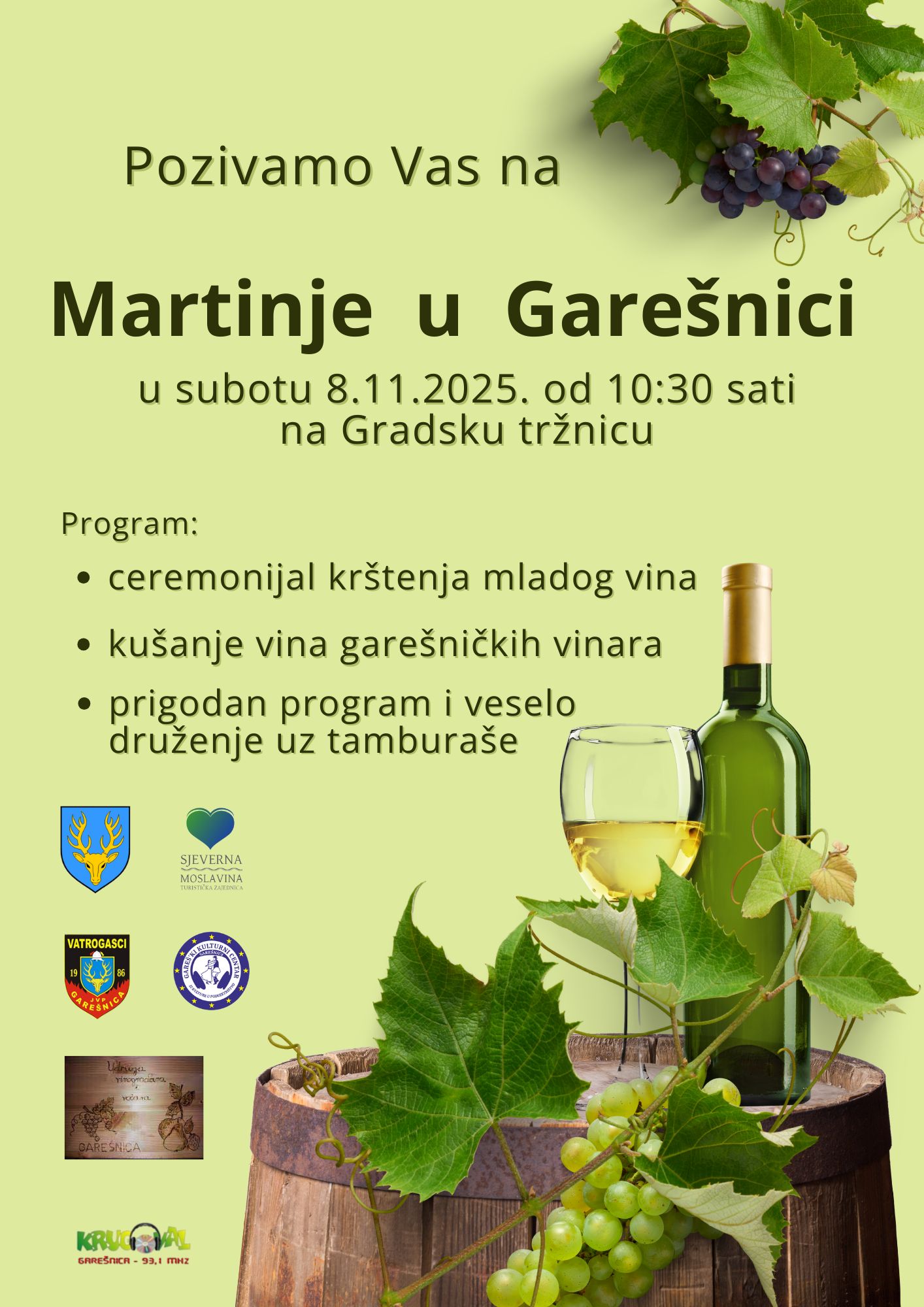 I ove godine Grad Garešnica i Turistička zajednica Sjeverna Moslavina, u suradnji s Udrugom vinogradara i voćara Garešnica, Javnom vatrogasnom postrojbom Garešnica i Gareš’kim kulturnim centrom, organiziraju V. Garešničko Martinje. Manifestacija će se održati u subotu, 8. studenoga, od 10:30 sati na Gradskoj tržnici u Garešnici.
