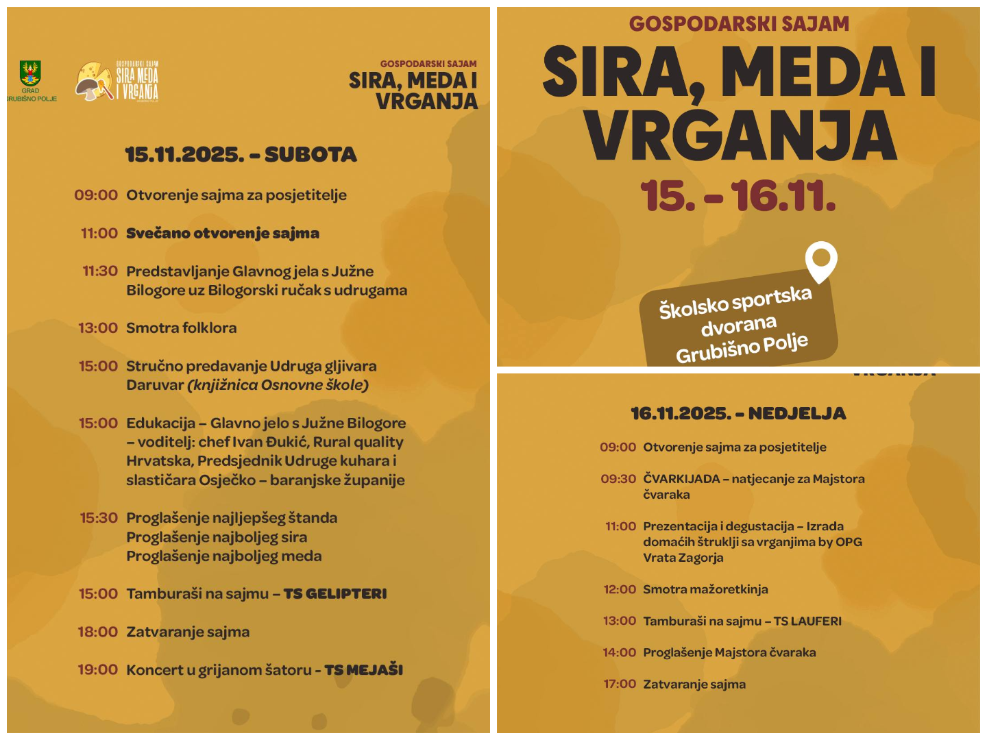 Ovog vikenda, 15. i 16. studenoga, u školsko-sportskoj dvorani u Grubišnom Polju održava se 19. Gospodarski sajam sira, meda i vrganja, koji će okupiti više od stotinu izlagača iz cijele Hrvatske. Događaj organiziraju Grad Grubišno Polje, Turistička zajednica područja Južna Bilogora i Razvojna agencija AGRO.