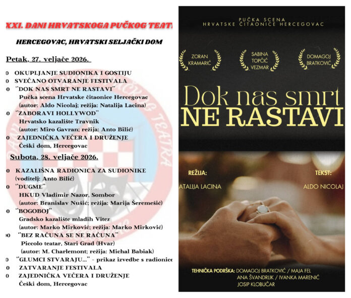 Ovogodišnji, 31. Dani Hrvatskog Pučkog teatra najavljeni su za zadnji vikend, 27. i 28 veljače. I ove će godine povezati domovinsku i iseljenu Hrvatsku, kroz nastupe amaterskih družina; iz Bosne i Hercegovine stiže Hrvatsko amatersko kazalište Travnik i Gradsko kazalište mladih Vitez. Iz Srbije, odnosno Vojvodine, dolazi Hrvatsko kulturno umjetničko društvo Vladimir Nazor, a nastupit će Piccolo i teatar iz Starog Grada na otoku Hvaru. Festival će svečano otvoriti domaćin, Pučka scena Hrvatske čitaonice Hercegovac, predstavom „Dok nas smrt ne rastavi“.
