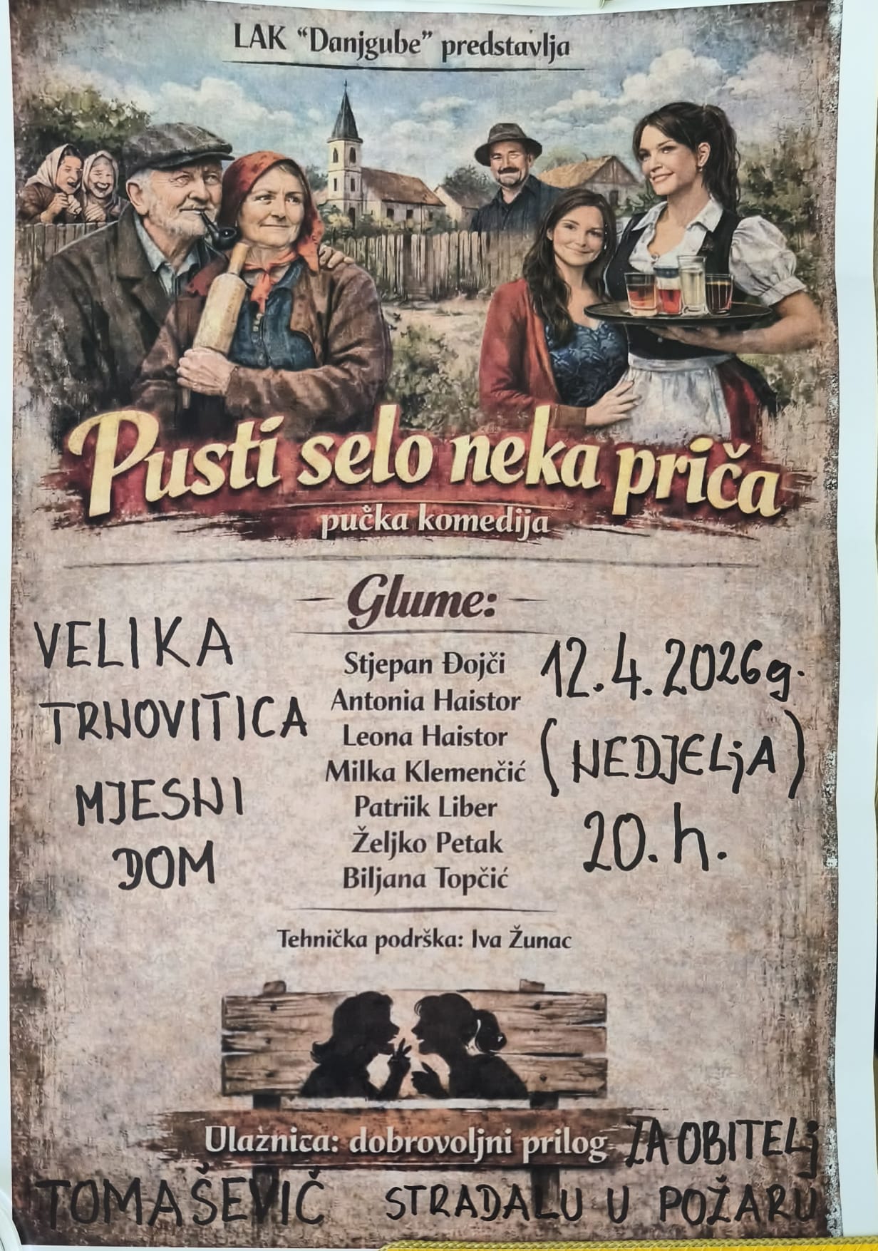 Poziv na predstavu uputio je predsjednik LAK Danjgube, Željko Petak, istaknuvši kako će ova večer biti prilika za smijeh, ali i za zajedništvo i pomoć drugima.