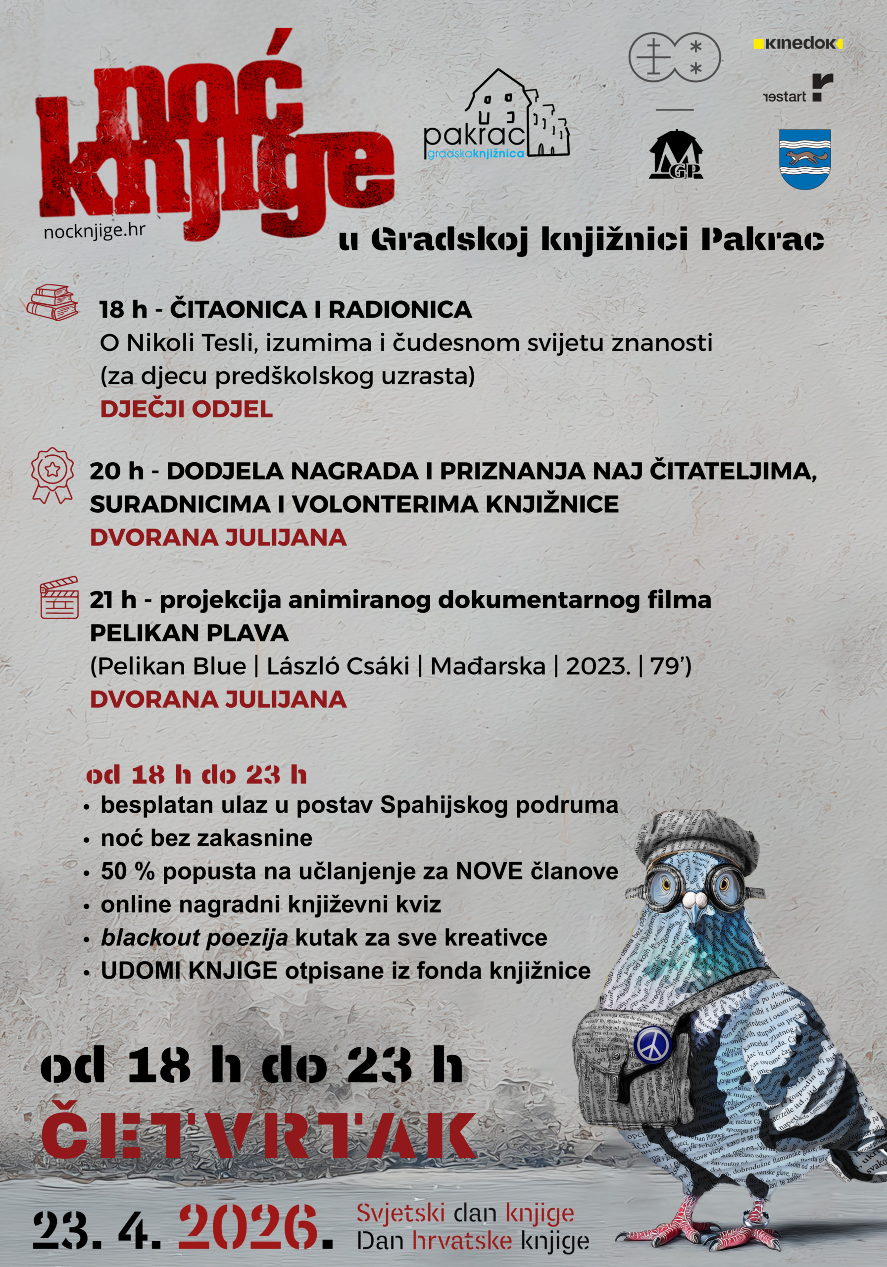 Gradska knjižnica Pakrac i ove se godine pridružuje nacionalnoj manifestaciji Noć knjige koja slavi knjigu, čitanje i snagu riječi. Ovogodišnje izdanje održat će se u četvrtak, 23. travnja, od 18 do 23 sata i to po prvi put u novom prostoru Spahijskog podruma.